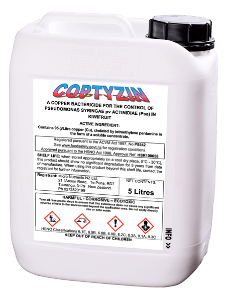 Coptyzin is a chelated copper bactericide for the control and prevention of Psa in kiwifruit orchards.
